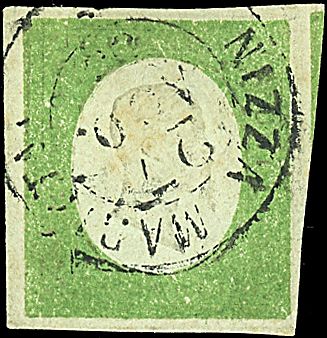 1854 - 5 c. verde giallo (7) SPL e ben marginato - Sigla EMD (1.250,00)