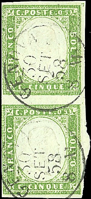 1859 - 5 c. verde giallo, stampa difettosa, III tav. (13Be) in coppia SPL - Cert. Manzoni (4.750,00)