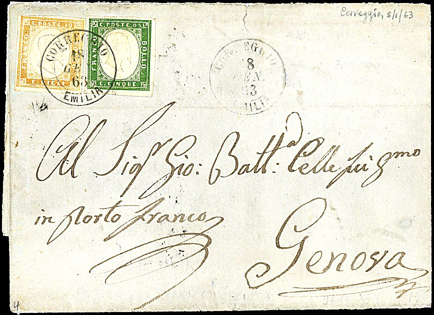 1863 - 5 c. verde cupo (13E) + 10 c. bistro (14E) su lettera da CORREGGIO (18/1/63 - p. 4) a Genova (350,00)