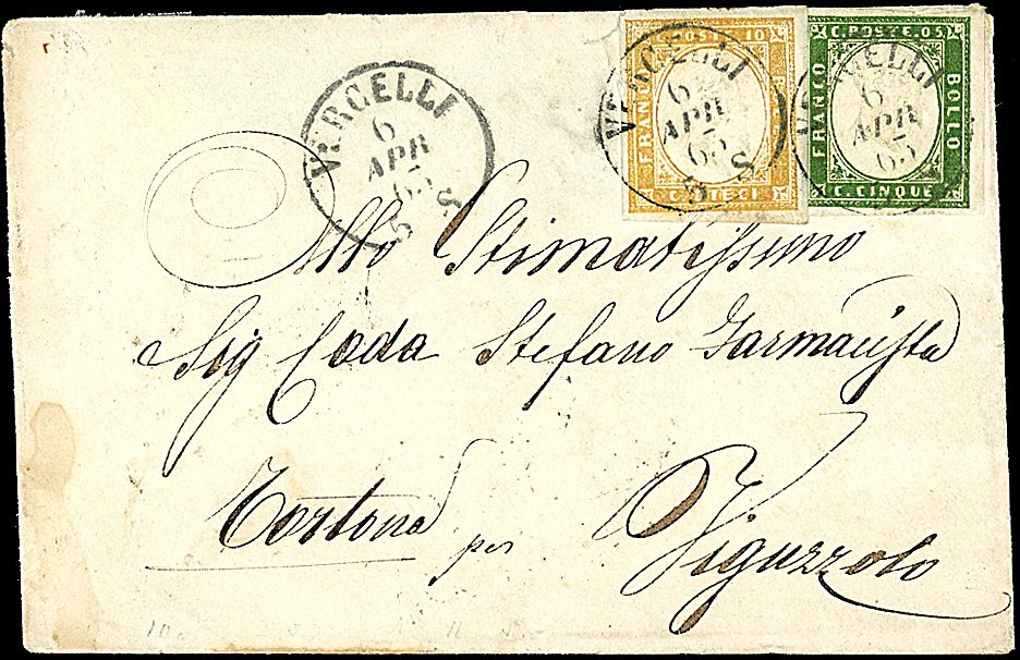 1863 - 5 c. verde cupo (13E) + 10 c. bistro (14E) su lettera da VERCELLI (6/4/63) a Viguzzolo (230,00)