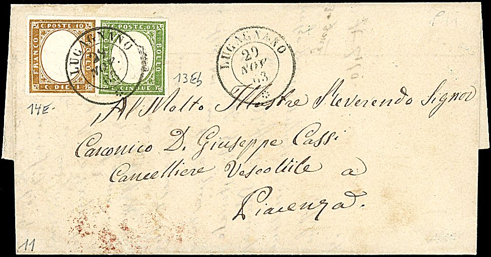 1863 - 5 c. verde chiaro smorto (13Eb) + 10 c. bistro (14E) SPL su lettera da Lugagnano (29/11/63 - p. 11) a Piacenza (3.950,00)