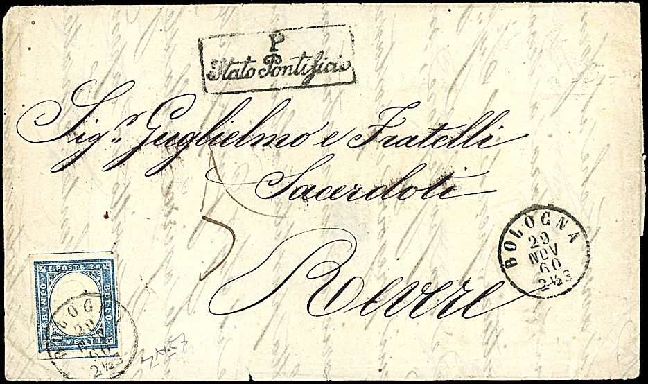 1860 - 20 c. azzurro grigio (15Cc) SPL su lettera da BOLOGNA (29/11/60) a Revere - A lato bollo in cartella P. Stato Pontificio (p. 3) - Cert. Avanzo (1.560,00)