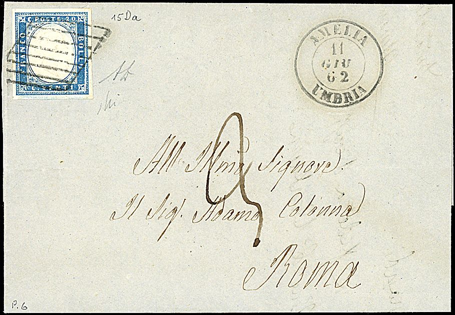 1861 - 20 c. celeste (15Da) SPL su lettera da AMELIA UMBRA (11/6/62) a Roma - Cert. Avi