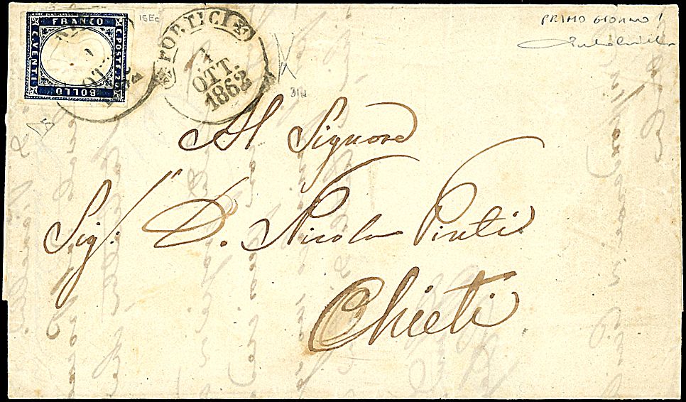 1855 - 20 c. indaco (15E) difettoso su lettera da PORTICI 1 OTT. 1862 - Primo giorno d'uso - Rara! - Cert. Bottacchi + sigla ED