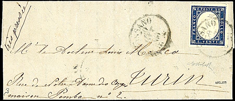 1862 - 20 c. indaco (15E) SPL su lettera da FOSSANO (p. 3) a Torino (270,00)