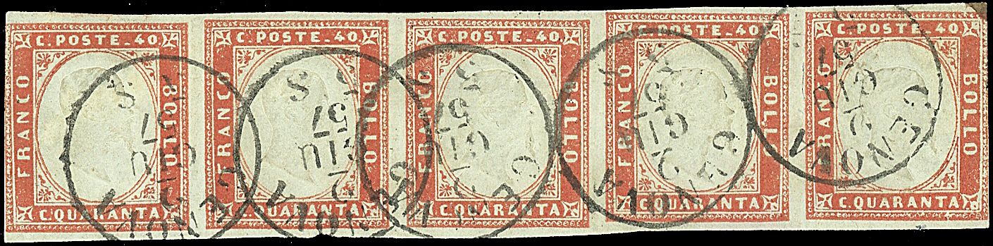 1855 - 40 c. vermiglio (16a) in striscia di 5 annullata Genova - Difettosa ma sicuramente d'effetto - Cert. AD + cert. Manzoni (10.000,00)