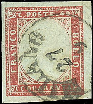 1859 - 40 c. rosso carminato (16Bb) SPL con annullo Milano - sigla Ray (375,00)