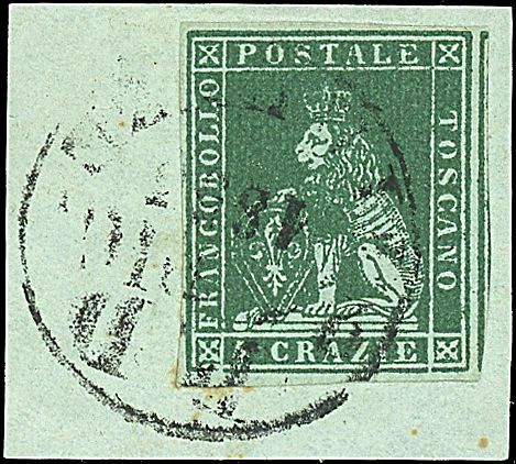 1851 - 4 cr. verde su grigio (6) SPL su frammento (390,00)