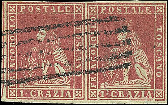 1857 - 1 cr. carminio (12) in coppia SPL e ben marginata - Un valore presenta parte di filigrana lettere - Cert. Colla + cert. Caffaz (3.250,00)