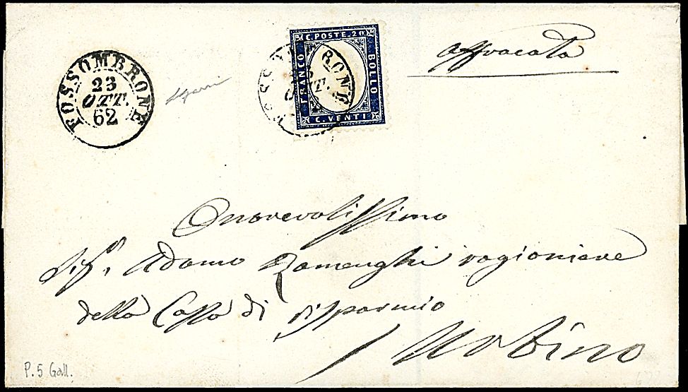 1862 - 20 c. indaco (2) su lettera da FOSSOMBRONE (23/10/62) a Urbino