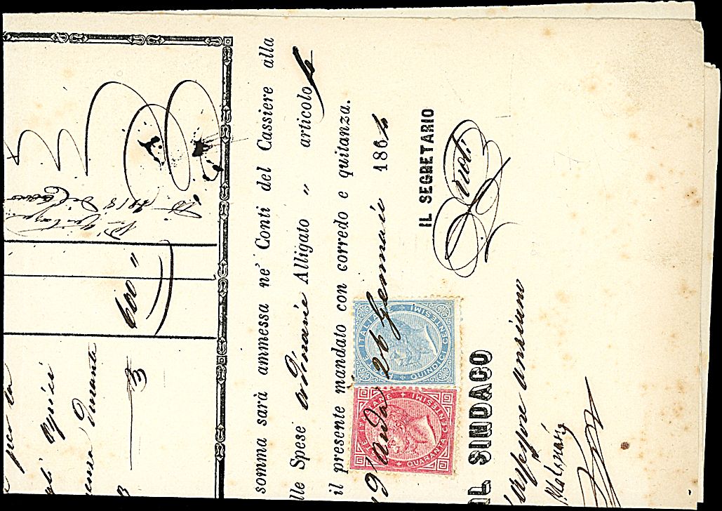 1864 - 15 c. celeste chiaro (L18) + 40 c. rosa carminio (L20) SPL su mandato di pagamento del 26.01.1864 annullati a penna per uso fiscale - Interessante