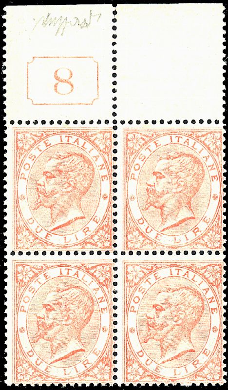 1863 - L. 2 scarlatto chiaro (L22) in quartina SPL con b.f. in alto e numero 8 di tavola - Cert. Caffaz (4.050,00)