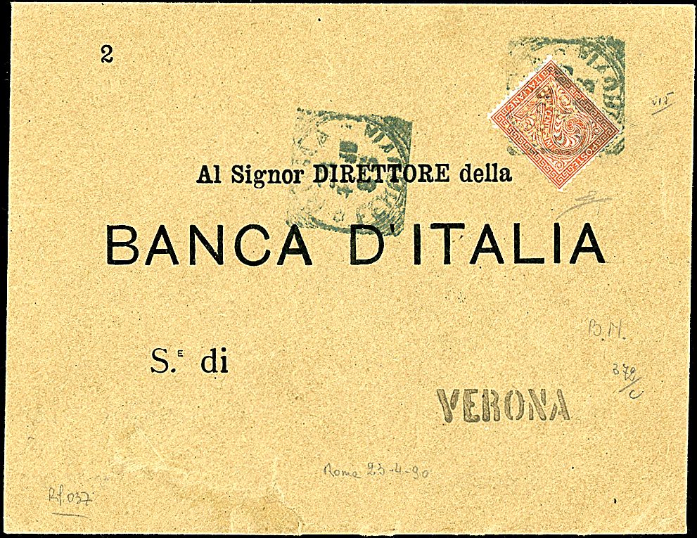 1890 - 2 c. rosso mattone (T15) con perforazione BI su busta da Verona (23/4/90) per cittā - Non comune - Sigla RD