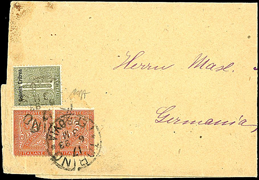 1863 - 2 c. rosso mattone (T15) in coppia + Eritrea 1 c. verde oliva (1) in affrancatura mista su fascetta per giornali da TORINO (17/6/93) a Chemnitz - Germania - Non comune - Cert. Caffaz