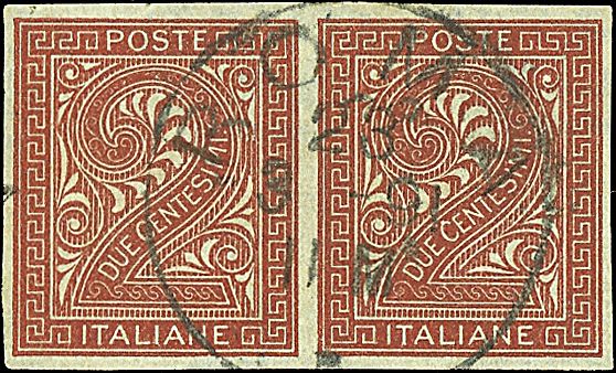 1863 - 2 c. rosso mattone, non dentellato (T15d) in coppia SPL annullata ROMA - Sigla RD (650,00)