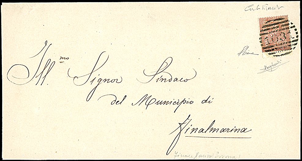 1863 - 2 c. rosso mattone, con doppia dentellatura in basso (T15f) SPL con b.f. in basso su lettera da Genova a Finalmarina - Rara, due buste conosciute! - Cert. Ray + cert. R Diena + cert. Vicario