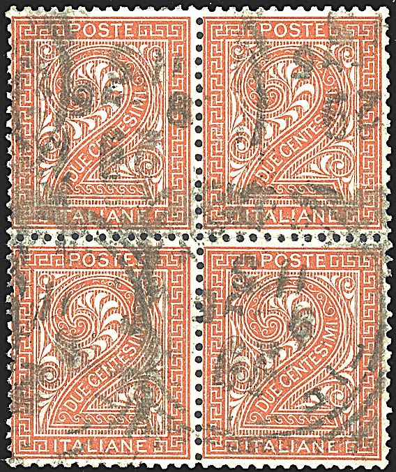 1863 - 2 c. rosso mattone, con filigrana capovolta (T15h) in quartina SPL e ben centrata - Cert. RD