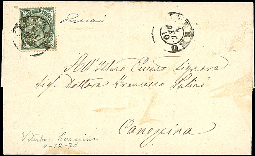 1870 - 5 c. verde grigio scuro (T16) su lettera da Viterbo (4/12/70) a Canepina - Non comune - Sigla Vaccari