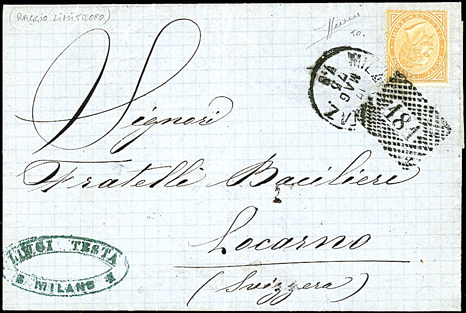 1863 - 10 c. giallo ocra (T17) SPL su lettera da Milano (4/5/75) a Locarno (Svizzera) in tariffa raggio limitrofo - Sigla Sorani