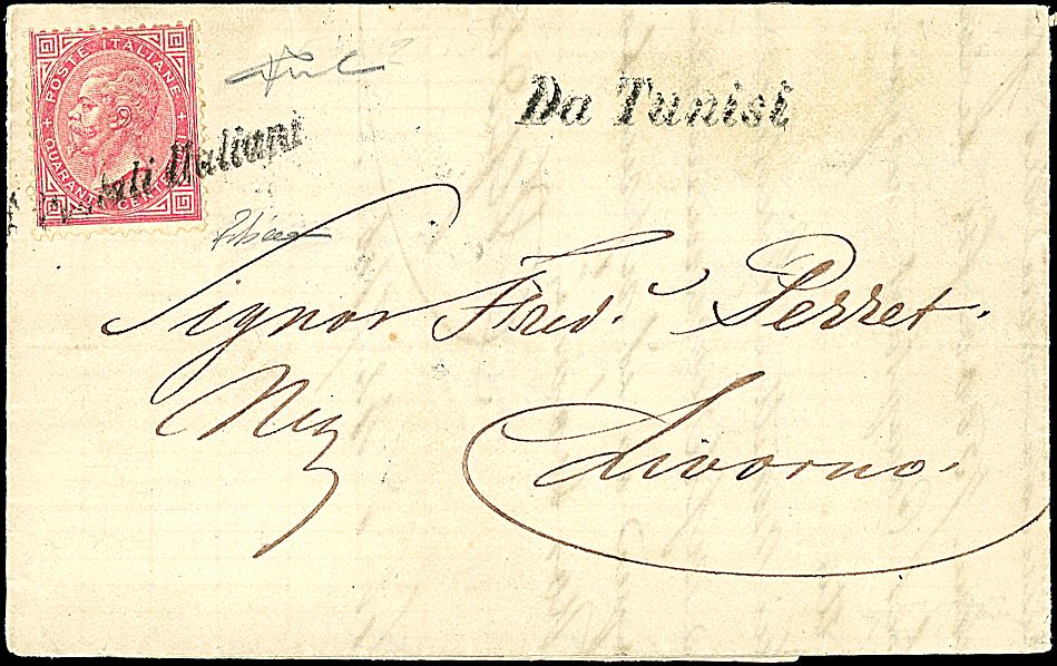 1863 - 40 c. rosso carminio (T20) SPL su lettera da Tunisi Coi postali Italiani (6/8/73 - p. 12) a Livorno - Non comune - Cert. R. Diena + cert. Vicario (6.000,00)