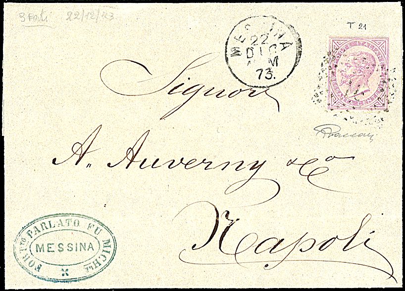 1873 - 60 c. lilla (T21) SPL e centratissimo su lettera da Messina (22/12/73) a Napoli - Sigla Vaccari