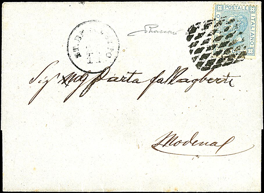 1867 - 20 c. celeste chiaro (L26) su lettera da S. Benedetto sfuggito all'annullo e timbrato in arrivo con il muto di Modena - Rara - Sigla Vaccari