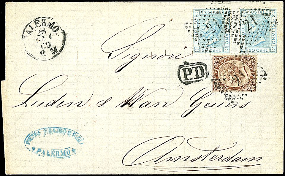 1869 - 30 c. bruno castano (T19) + 20 c. azzurro (T26) due val. su lettera da Palermo (28/1/69) ad Amsterdam con bollo a numerale e punti