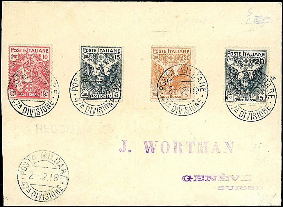 1915/16 - Croce rossa (102/105) Serie cpl. 4 val. su busta con annullo di posta militare (2/2/16) a Ginevra - Bollo di arrivo
