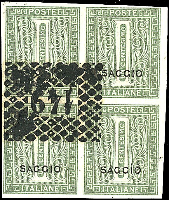 1863 - Prove di annullamento - 1 c. verde grigio chiaro con soprastampa SAGGIO e annullo di prova a rombi e cifra 149 - In quartina SPL - Cert. R. Diena