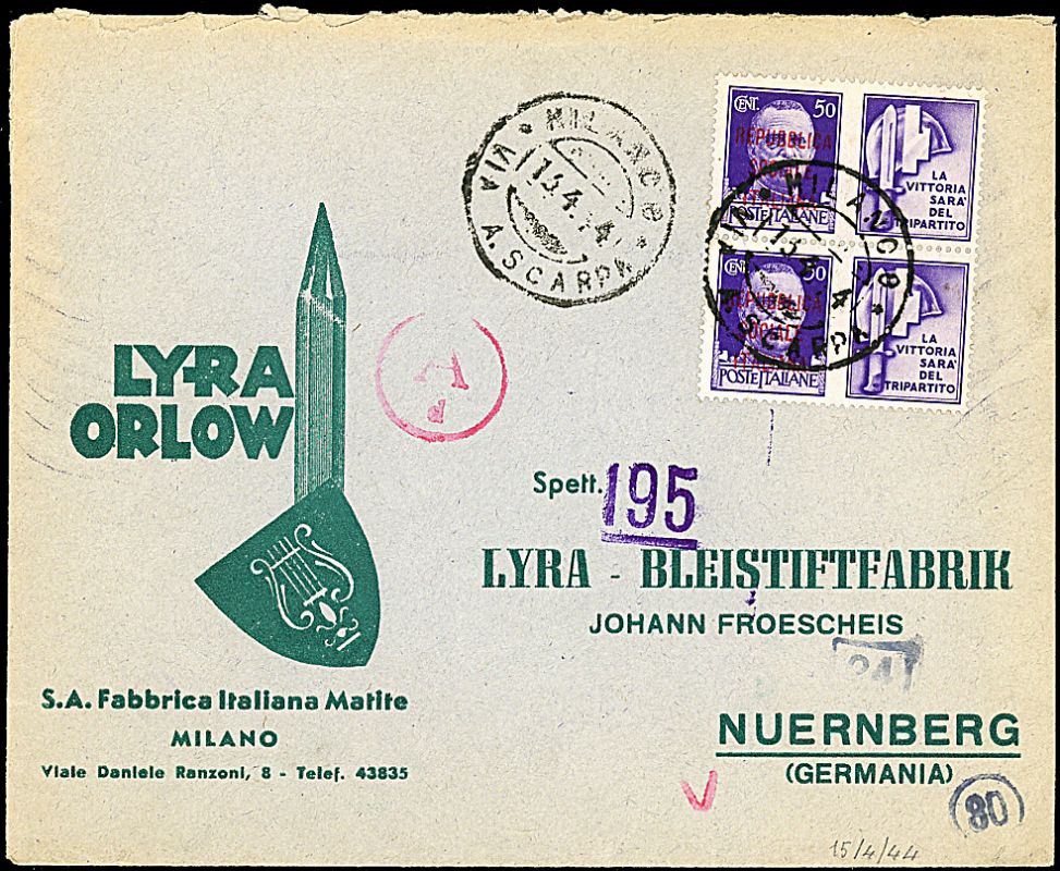 1944 - 50 c. violetto (36) in coppia su busta verificata per censura da Milano (15/4/44) a Norimberga - Non comune