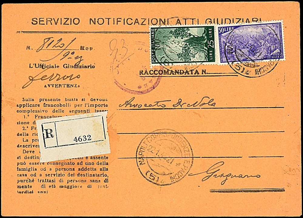 1949 - Democratica L. 25 verde scuro (562) + Risorgimento L. 50 violetto (590) su busta da Napoli (22/1/49) a Gragnano