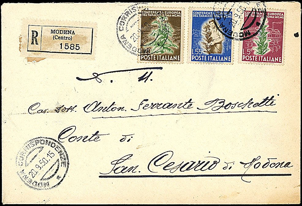 1950 - Tabacco (629/631) Tre val. SPL su busta raccomandata da Modena (20/9/50) a San Cesario - Bollo di arrivo