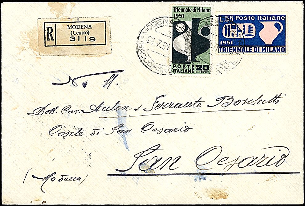 1951 - Triennale di Milano (666/667) Due val. SPL su busta raccomandata da Modena (28/7/51) a San Cesario - Bollo di arrivo