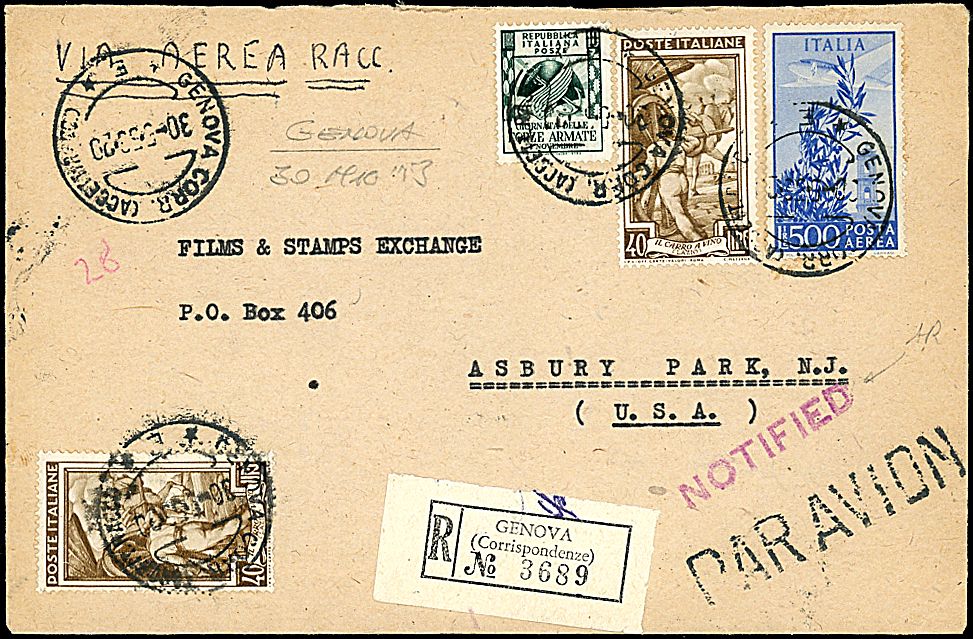 1953 - L. 500 oltremare (144) + val. complementari di posta ordinaria su busta raccomandata da Genova (30/5/53) a Asbury Park N.Y. - Bollo di arrivo
