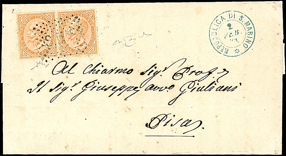 1870 - 10 c. giallo ocra, tir. di Torino (F4T) in coppia con annullo a punti S.M.no + doppio cerchio in azzurro su lettera da San Marino (2/2/71) a Pisa - Bollo di arrivo - Rara! - Cert. Ray (6.000,00)