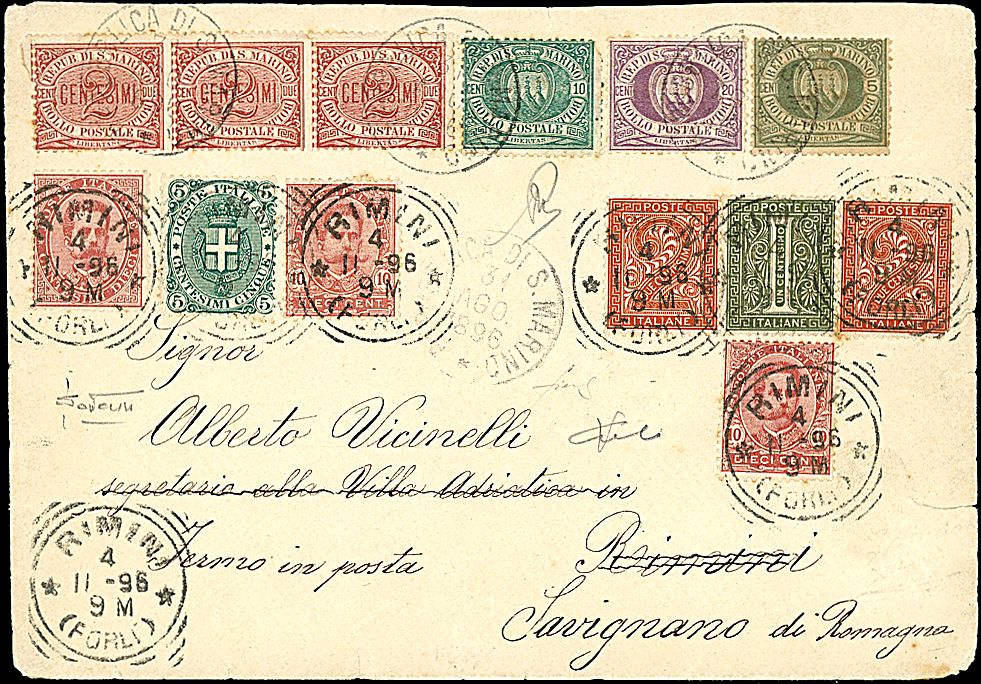 1896 - Splendida affrancatura per 41 cent. su busta da San Marino (31/8/96) a Rimini dove non fu ritirato e rispedito con affrancatura di Italia per Savignano di Romagna - Spettacolare combinazione “due Stati e due Re” - Cert. Fiecchi + cert. Vicario