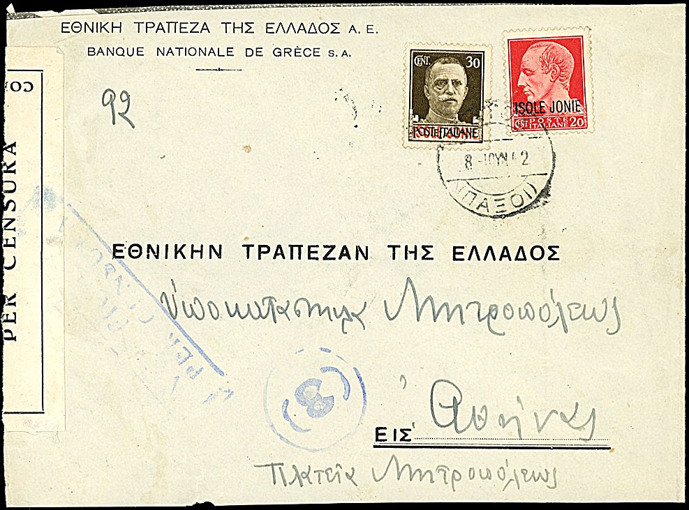 1942 - 20 c. carminio (3) + 30 c. bruno (5) su busta verificata per censura da Gaios (8/6/42) ad Atene