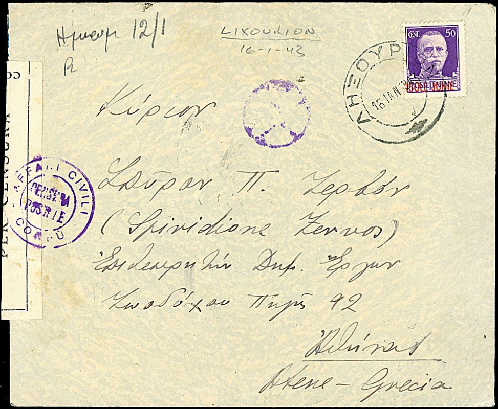 1943 - 50 c. violetto (6) su busta verificata per censura da Lixuri (16/1/43) ad Atene