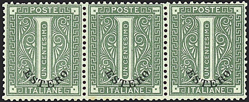 1874 - 1 c. verde oliva in striscia di tre di cui un valore con 3 puntini (1+1d) SPL - Sigla RD