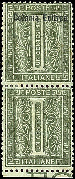 1893 - 1 c. verde oliva, in coppia verticale di cui uno senza soprastampa (1e) BB e con b.f. in basso - Rara! - Cert. R. Diena (9.000,00)