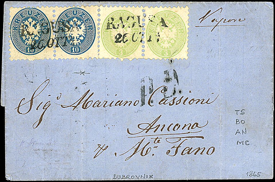 1865 - 3 k. verde (2) in coppia + 10 k. azzurro (30) in coppia su lettera da RAGUSA (26/10/65) ad Ancona