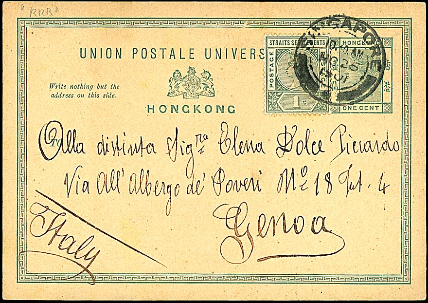 1901 - 1 c. + 1 c. verde da Singapore (25/11/01) a Genova - Rara!