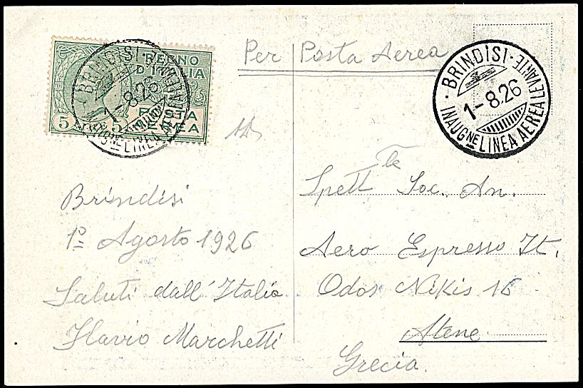 1926 - Brindisi - Atene - Cartolina speciale annullata Brindisi (1/8/26) ma non volata (Longhi 1579)