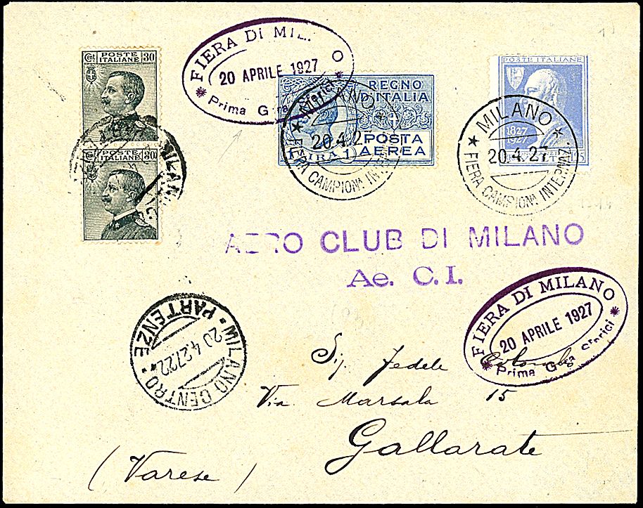1927 - Milano / Gara palloni sferici - Busta commemorativa da Milano (20/4/27) a Gallarate - Bollo di arrivo - Pochi esemplari conosciuti (Longhi 1713)