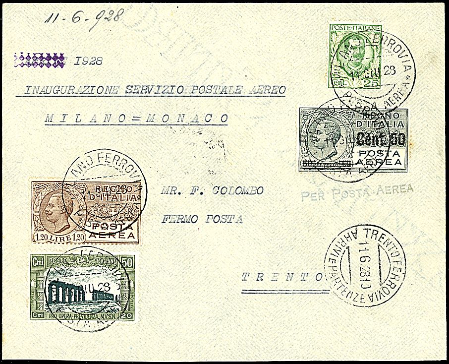 1928 - MILANO - TRENTO - Aerogramma affrancato con 50 su 60 c. grigio (8) + L. 1,20 bruno (5) da Milano (11/6/28) a Trento - Non comune (Longhi 1848 - Valore francobolli 680,00)