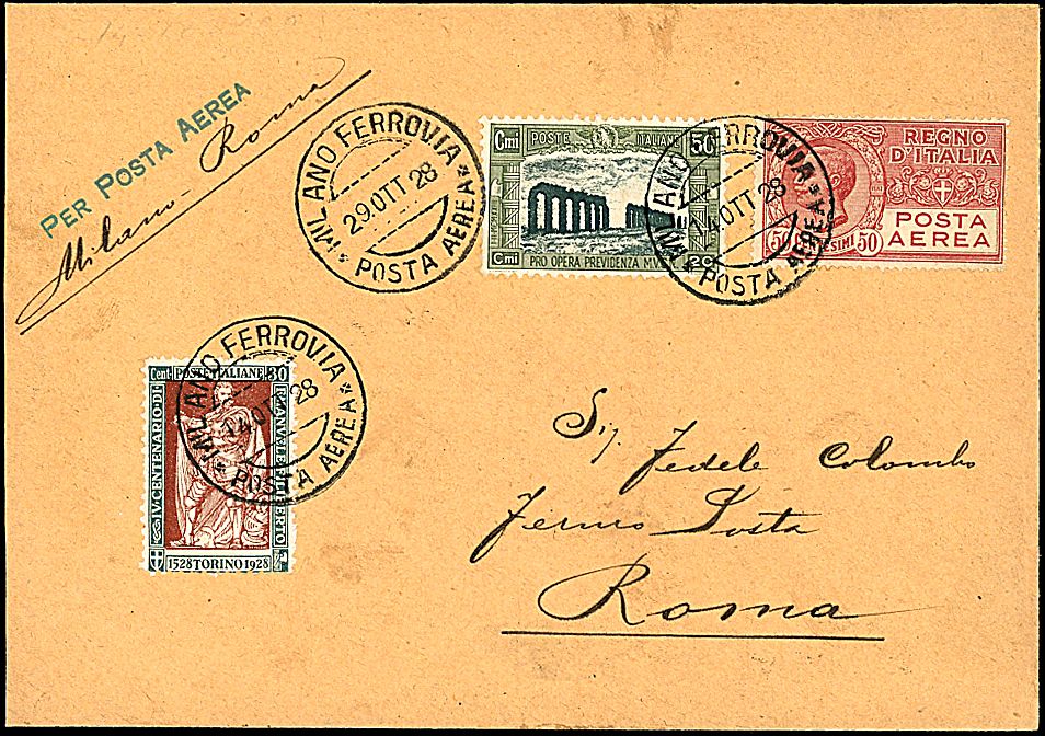 1928 - Volo inaugurale Milano - Roma - Aerogramma da Milano (14/10/28) a Roma - Bollo di arrivo (Longhi 1870)