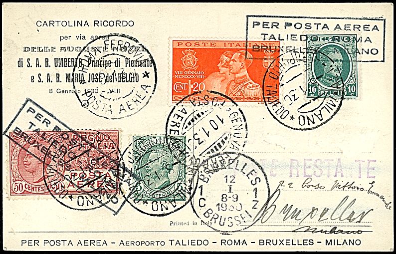 1930 - MILANO - ROMA - BRUXELLES - Busta nozze Principi di Piemonte da Roma (8/1/30) a Bruxelles, via Genova - Bollo di arrivo (Longhi 2056)