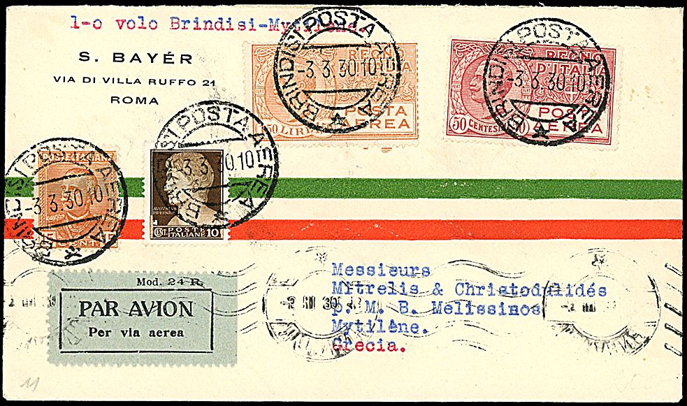 1930 - Volo Brindisi - Mitilene - Aerogramma da Brindisi (3/3/30) a Mitilene - Bollo di arrivo - Rara, 35 volati (Longhi 2097)