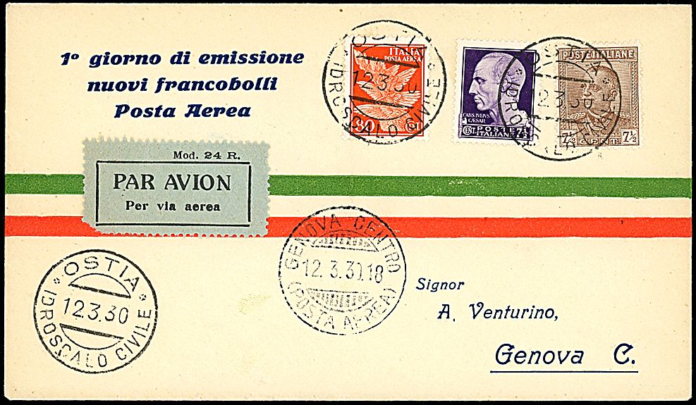 1930 - Aerogramma da Ostia (12/3/30) a Genova - Bollo di arrivo (Longhi 2099)