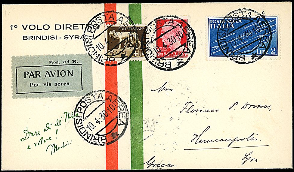 1930 - Volo Brindisi - Syra - Aerogramma da Brindisi (10/4/30) a Syra - Bollo di arrivo - Pochi aerogrammi volati! (Longhi 2114)